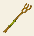 | Ce splendide bâton est muni de très belles dents à son extrémité, ce qui en fait un excellent fourcher. Farle s'en servait pour créer d'immenses meules de foin, plus hautes que le plus grand des Ormes qui poussait jadis en forêt de Litneg. On raconte que c'est Brouce Boulgoure en personne qui aurait coupé le bois nécessaire à la fabrication de ce bâton, en échange des monstrueuses rations quotidiennes de flocons d'avoine offertes par Shika Ingalsse, qu'il engouffrait avant de partir raser des forêts complètes. | ||||